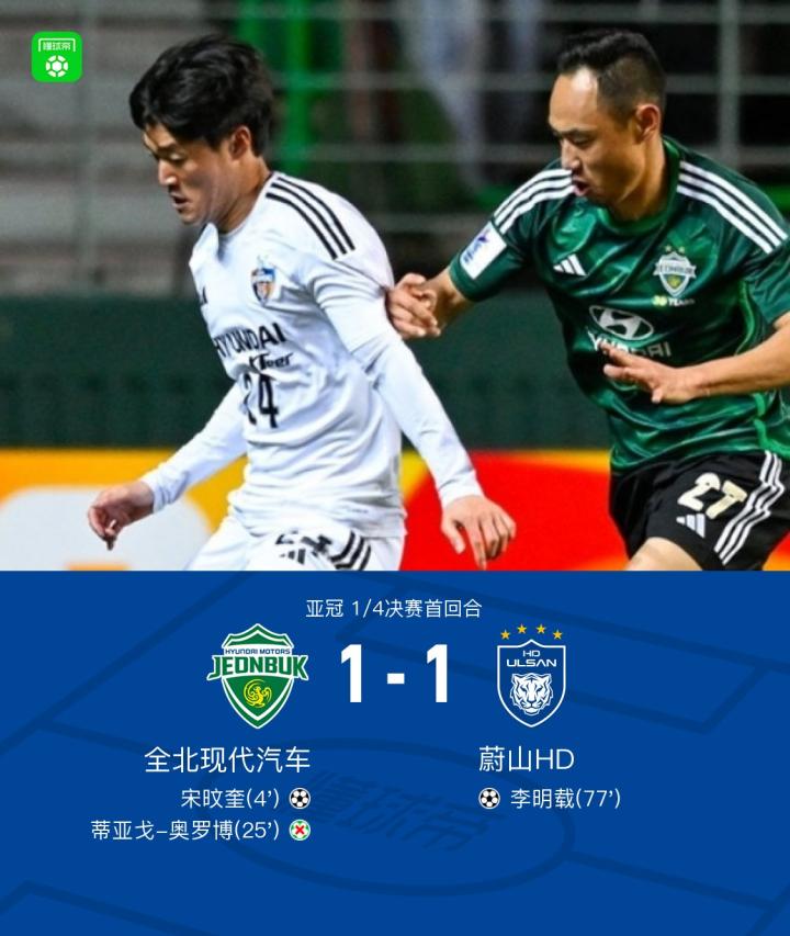北京时间3月5日亚冠 1/4决赛首回合,全北现代汽车主场对阵蔚山HD。上半场刚开场李东俊传中助攻宋旼奎破门,之后李东俊造点,奥罗博的点球踢到了门框上弹出底线。下半场郑泰昱解围变乌龙助攻,李明载破门扳平。最终全北现代1-1战平蔚山HD。