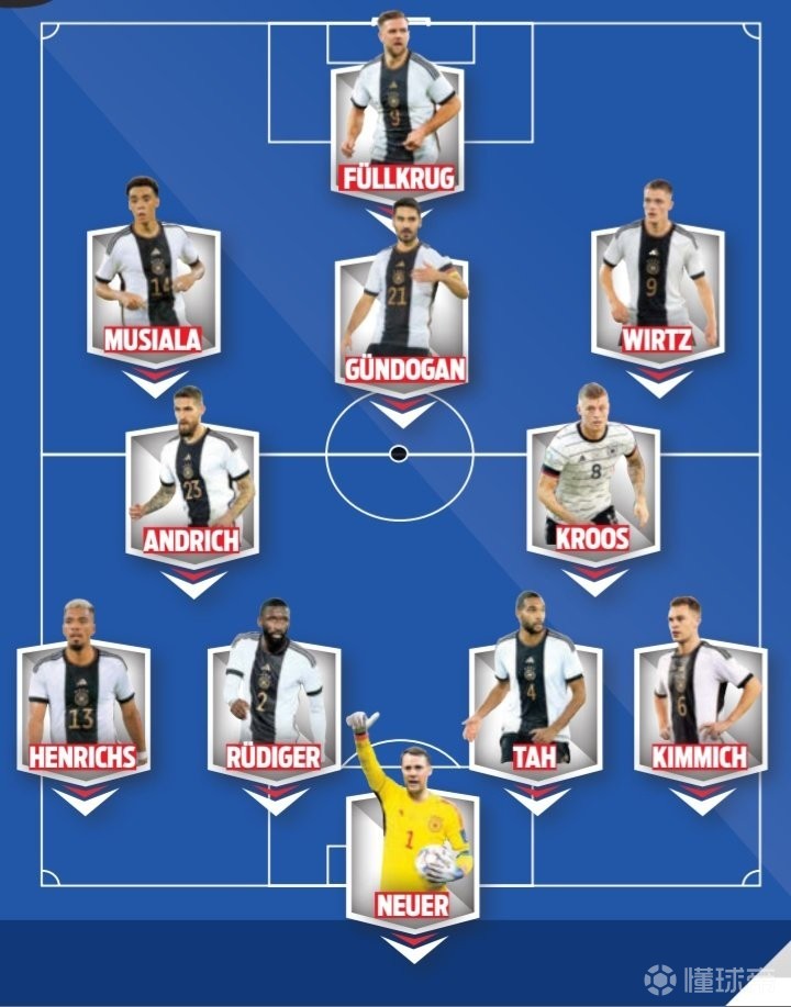 《体育图片报》分析了德国国家队今夏欧洲杯将会使用的主力阵容,诺伊尔、基米希、托尼-克罗斯、京多安、穆西亚拉以及维尔茨上榜。