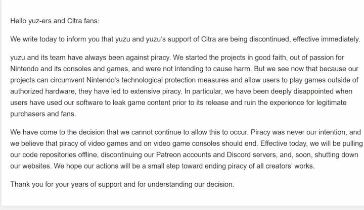 Yuzu及其团队一直反对盗版。我们出于对任天堂和它们的游戏机的热情,满怀真诚地启动了该项目,并且无意造成伤害。但我们的项目确实可以绕过任天堂的技术保护措施,允许用户在授权硬件之外玩游戏,因此导致了广泛的盗版现象。特别是当用户在游戏发布之前使用我们的软件游玩泄露游戏内容并破坏合法购买者和粉丝们的体验时,我们深感失望。