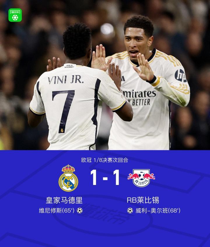 北京时间3月7日欧冠 1/8决赛次回合,皇家马德里主场对阵RB莱比锡。上半场,贝林厄姆推射被封堵,哈维-西蒙斯兜射被卢宁扑出。下半场,贝林厄姆助攻维尼修斯,奥尔班头球破门快速扳平比分,奥尔莫补时阶段击中门框,最终,皇马1-1莱比锡,总比分2-1晋级欧冠八强。
