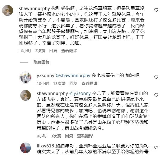 带伤拼完与横滨水手的首回合较量,刘洋:咬住一只熊 @懂球帝2024-03-07 08:43亚冠1/4决赛首回合交锋,山东泰山主场1-2不敌横滨水手。赛后,泰山队球员刘洋在社交媒体里透露,他是带伤拼完全场的。首回合比赛结束后,刘洋在社交媒体里晒照并写道:“咬住。”在这条动态下,有球迷留言鼓励刘洋,也希望他不要受伤。随后,刘洋回复说:“我也带着伤上的,加油吧。”刘洋门前立功,连续两次化解对手攻门展开更多
