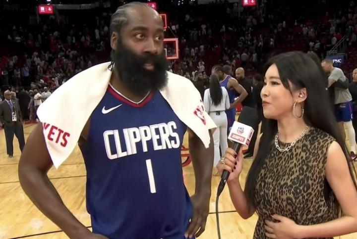 北京时间3月7日,NBA常规赛,快船客场122-116战胜火箭。赛后,快船队球员詹姆斯-哈登在接受记者采访时,披上了自己老东家火箭队的毛巾。