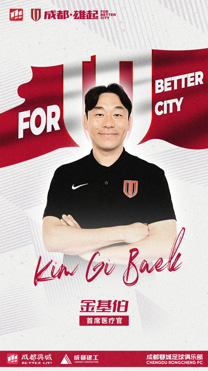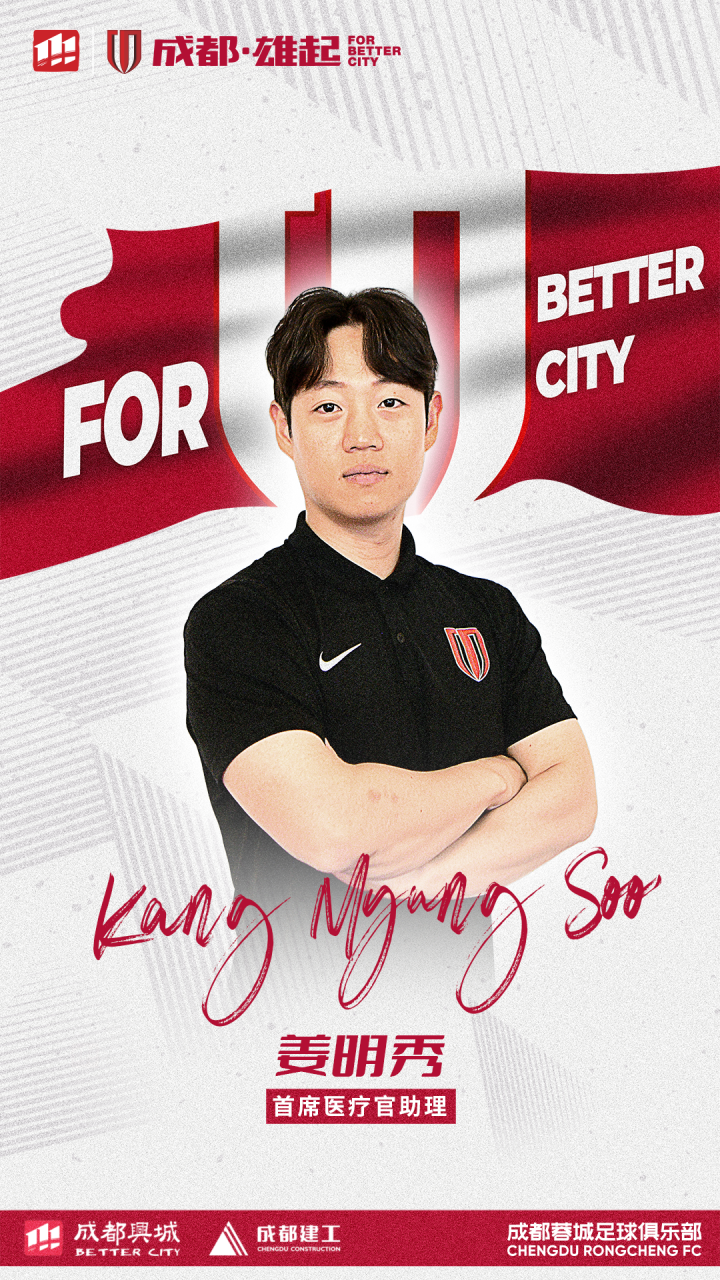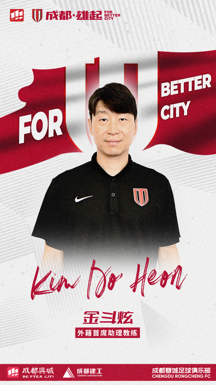 为加强一线队教练组的综合实力,经友好协商并达成一致,成都蓉城足球俱乐部正式聘请金斗炫先生担任外籍首席助理教练一职、金台镐先生担任技术分析师一职、金基伯先生担任首席医疗官一职,姜明秀先生担任首席医疗官助理一职。
