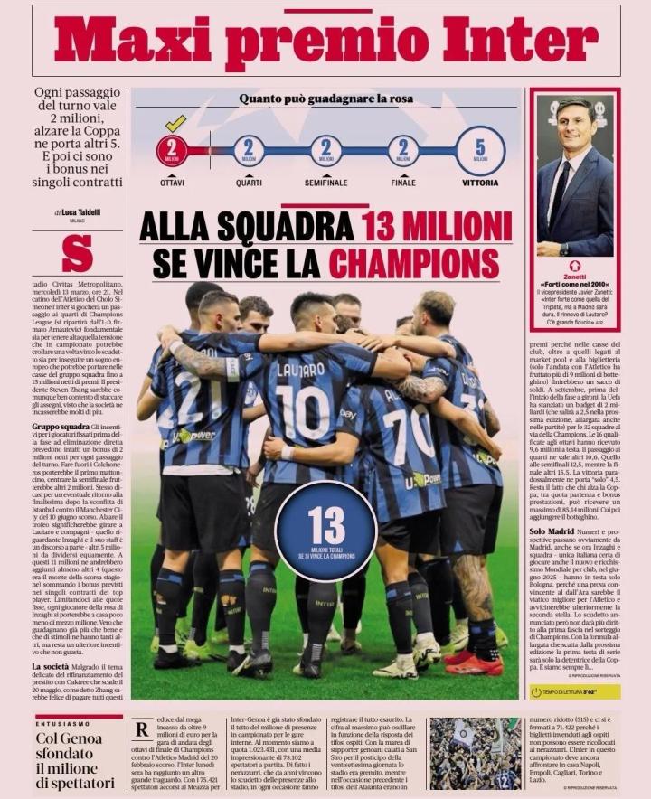 除此之外,国米还有不少球员的个人合同中有跟欧冠挂钩的奖金部分,如果能够夺冠这部分奖金额度也高达400万欧,平均没人能拿到50万欧。除了球员们可以获得的荣誉这样“虚”的东西外,球队也开出了高额奖金这样“实”在的激励,可以说是下足了力气!