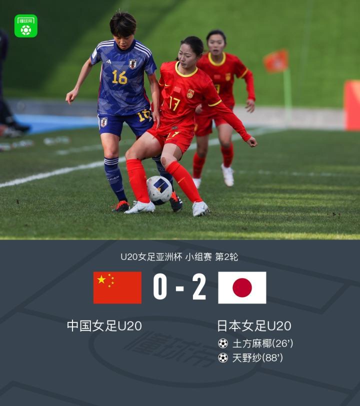 第88分钟,天野纱任意球直接破门,中国女足U20两球落后!