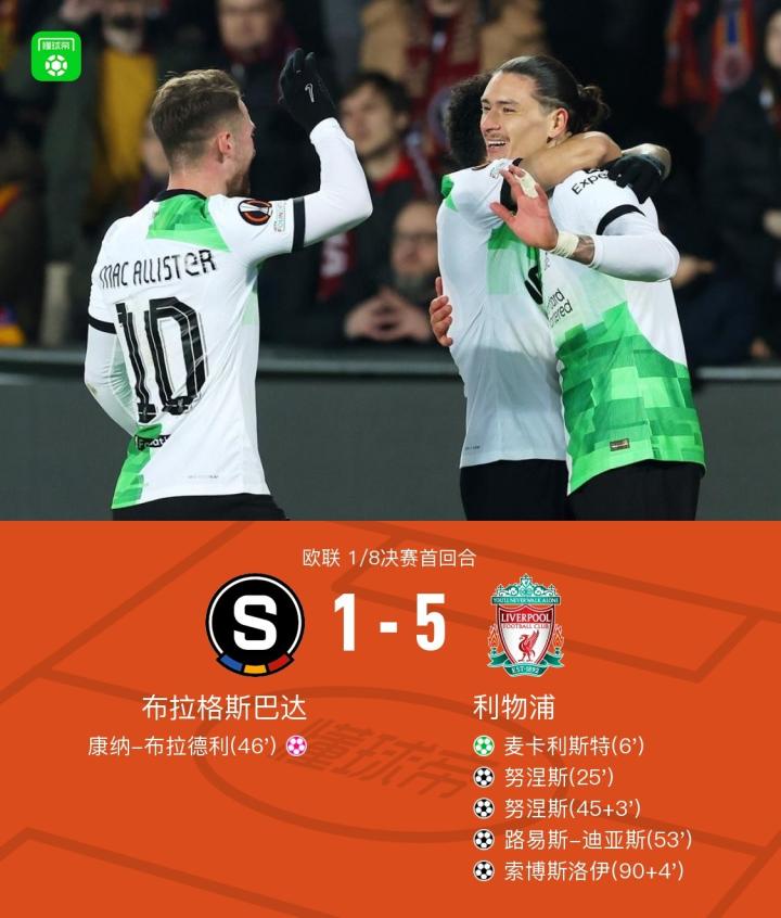 北京时间3月8日欧联 1/8决赛首回合,布拉格斯巴达主场对阵利物浦。上半场麦卡利斯特造点并亲自主罚命中,努涅斯世界波远射破门,半场结束前努涅斯凌空抽射梅开二度,下半场布拉德利打入乌龙,迪亚斯抽射变线破门,萨拉赫进球被吹,索博斯洛伊一条龙破门,最终利物浦5-1大胜布拉格斯巴达。