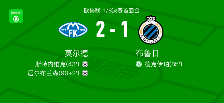 北京时间3月8日欧协联 1/8决赛首回合,莫尔德主场对阵布鲁日。莫尔德斯特内维克破门,居尔布兰森破门。布鲁日德克伊珀破门。最终比分2-1。