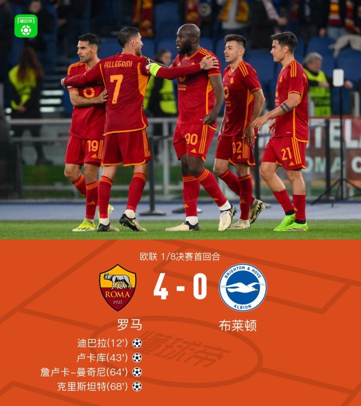 【罗马4-0布莱顿,卢卡库破门,迪巴拉建功,沙拉维助攻双响】