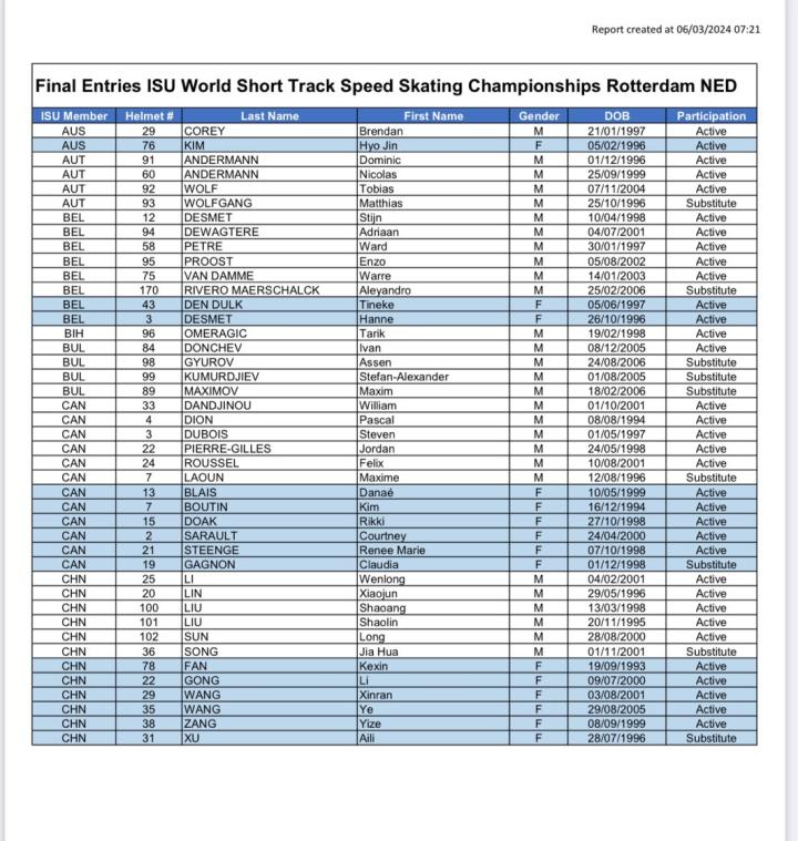 3月15日至17日,本赛季国际滑联短道速滑世锦赛将在荷兰鹿特丹举行,国际滑联官网日前公布了本次比赛各队的参赛名单。