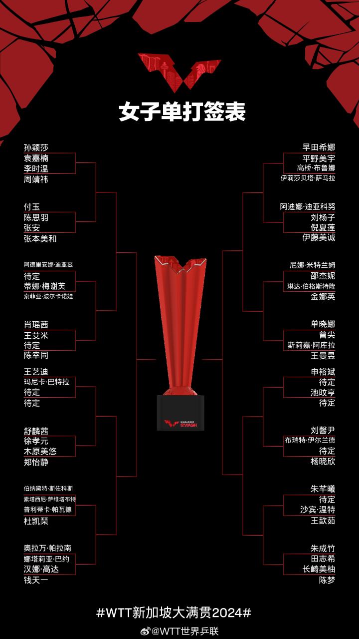 北京时间3月10日,2024年WTT新加坡大满贯正赛将正式开打,男女单签表正式出炉。