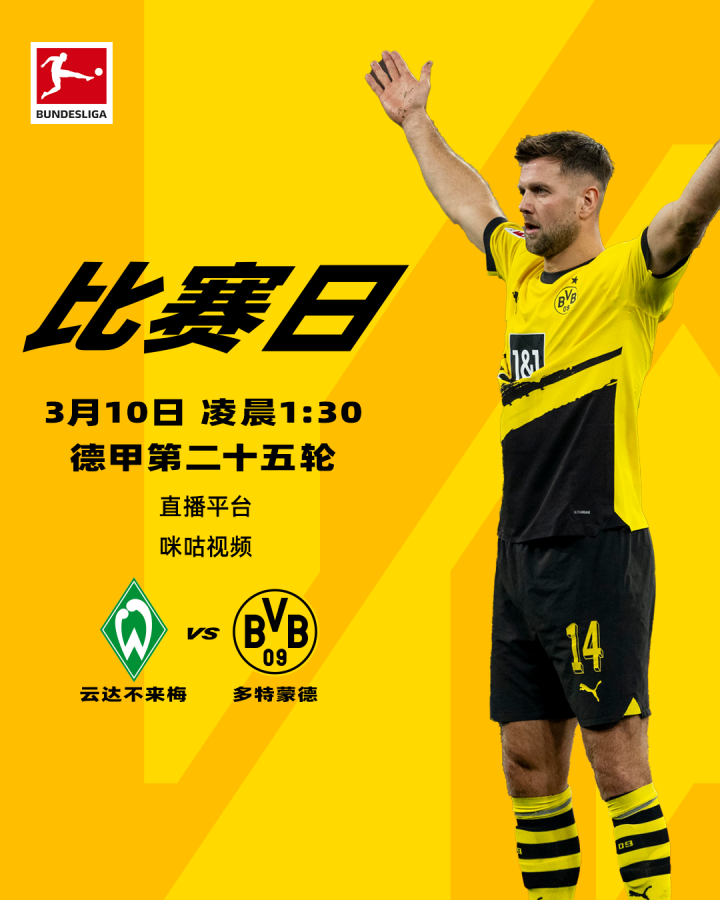 比赛日🕝3月10日 凌晨1:30⚔云达不来梅 v...多特蒙德足球俱乐部 @懂球帝2024-03-09 14:02比赛日 🕝3月10日 凌晨1:30 ⚔云达不来梅 vs 多特蒙德 🏟威悉体育场 👀直播平台:咪咕视频展开更多
