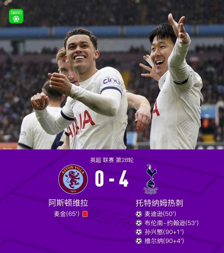 北京时间3月10日英超联赛第28轮,阿斯顿维拉主场对阵托特纳姆热刺。上半场双方争抢激烈,热刺半场0射门,沃特金斯拿球迟疑错失良机,半场结束前迪涅头球攻门制造威胁;下半场麦迪逊抢射打破僵局,孙兴慜助攻约翰逊破门迅速扩大领先,随后麦金侧后方大动作踹倒乌多基,被红牌罚下,孙兴慜和维尔纳补时阶段连入两球锁定胜局,最终热刺客场4-0大胜,少赛一场的情况下仅落后维拉2分。