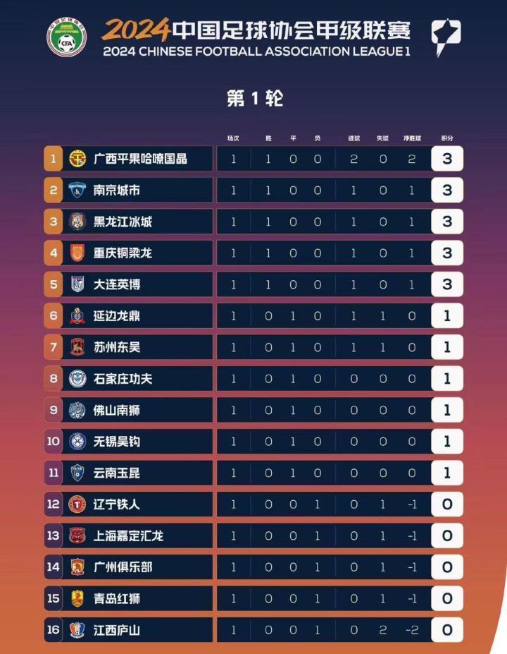 足球频道2024赛季中甲联赛首轮八场比赛战罢,共产生8粒进球,本土球员表现抢眼;4支升班马球队纷纷亮相,广西平果哈嘹以净胜球的优势领跑积分榜。