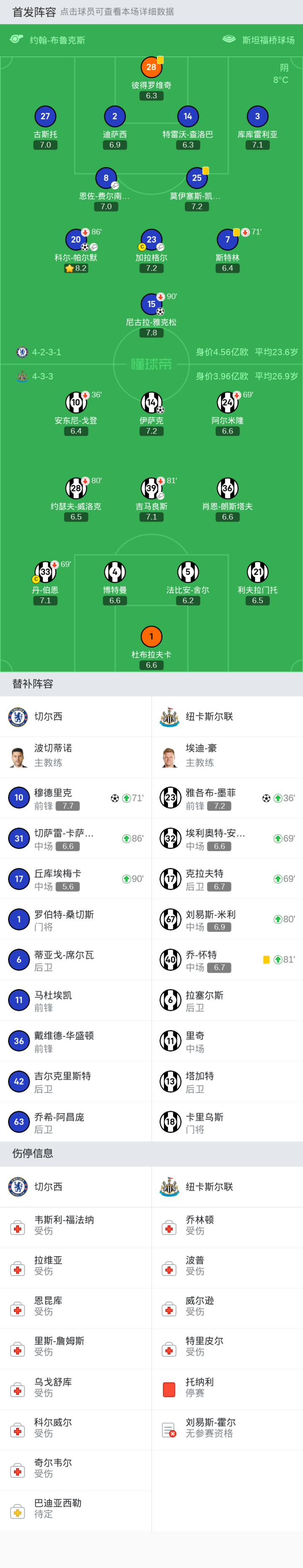 替补:6-蒂亚戈-席尔瓦, 1-罗伯特-桑切斯, 11-马杜埃凯, 42-吉尔克里斯特, 63-乔希-阿昌庞, 36-戴维德-华盛顿