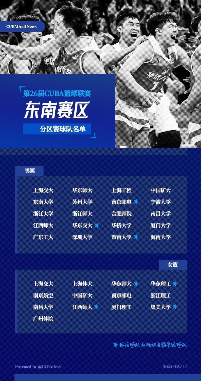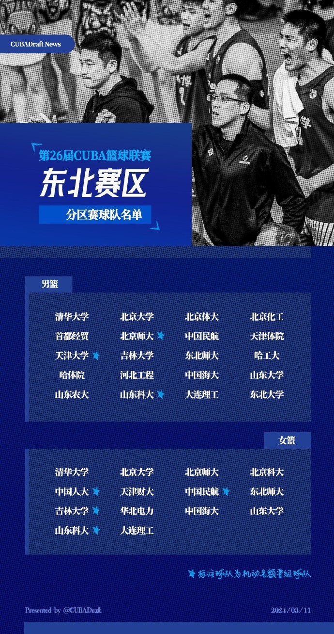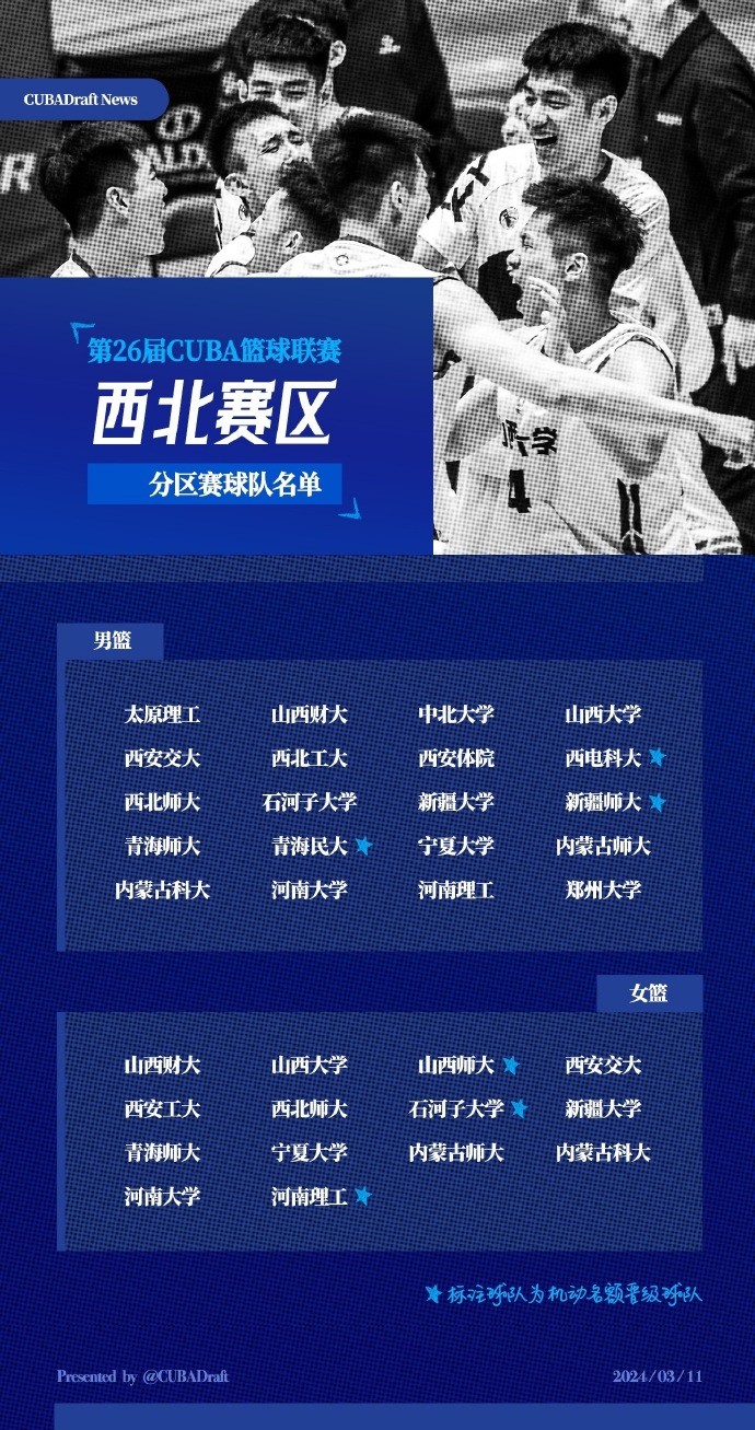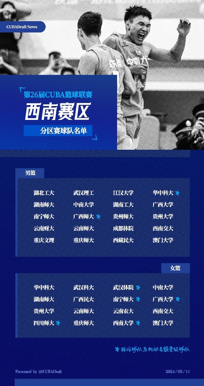 要来了!第26届CUBA分区赛球队名单公布德鲁不扣篮 @懂球帝2024-03-12 11:16北京时间3月12日,第26届CUBA一级联赛分区赛球队名单在今日正式公示,比赛分为东南、西南、东北、西北四大赛区,包括80支男篮球队和57支女篮球队。四大赛区中,东北赛区和东南赛区的竞争最为激烈,强队如云。3月22日,CUBA分区赛首战将在浙江舟山打响,让我们一起期待这场中国的大学生篮球盛宴吧!展开更多