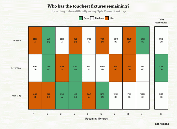 根据Opta的推演,利物浦将在此后迎来相对最轻松的赛程,曼城次之,阿森纳则将面临最艰巨的赛程考验,需要接连迎战曼城、阿斯顿维拉、热刺和曼联四大强敌。