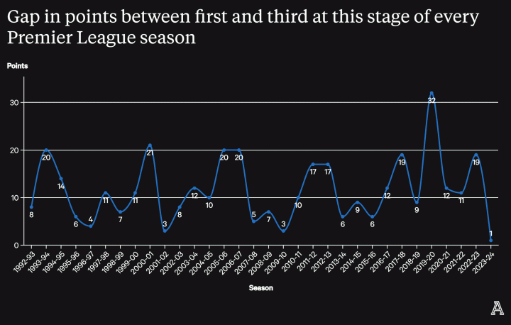 然而在英超,争冠集团内部依然战况胶着。赛季剩余10轮,积64分排名第一的阿森纳,仅以7个净胜球的毫厘胜算力压同分的利物浦、仅以1分的微弱优势领先排名第三的曼城。1992-93赛季以来,英超争冠从未如此白热化。