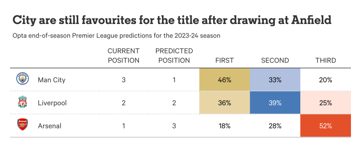 根据Opta的数据,目前暂列第三的曼城,依然最有可能(46%,利物浦36%,阿森纳18%)在季末捧起奖杯——这也意味着,蓝月军团将实现史无前例的英超联赛四连冠。尽管在上一个比赛日,曼城与利物浦在安菲尔德战平,阿森纳则凭借24小时前击败布伦特福德的胜利,坐收渔利登顶榜首。