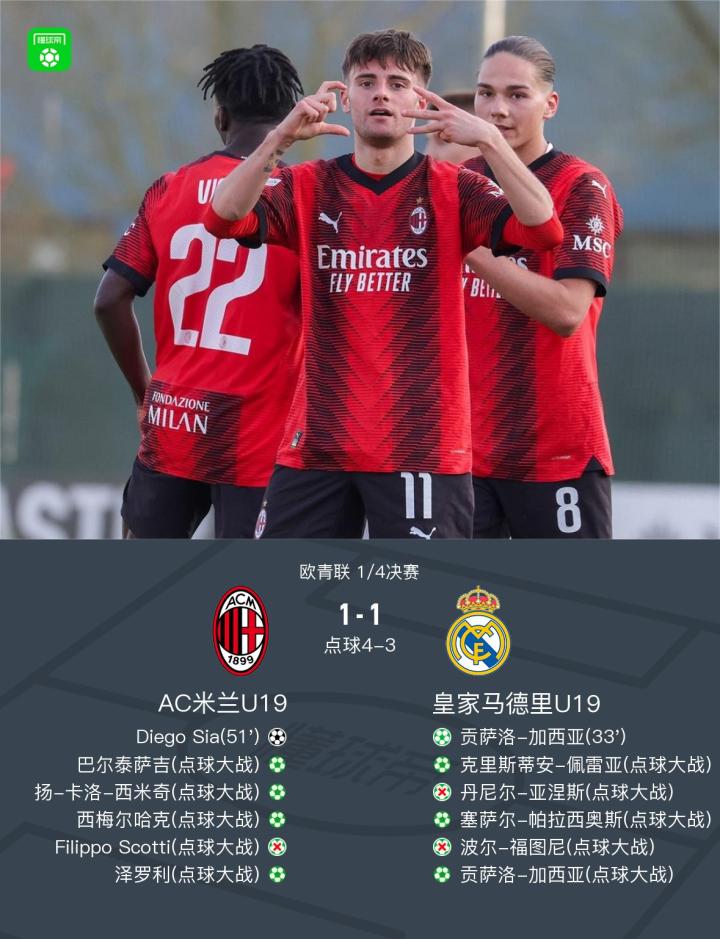在刚刚结束的一场欧青联1/4决赛中,米兰预备队在点球大战中击败皇马U19,连续第二年打进欧青联四强。