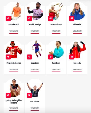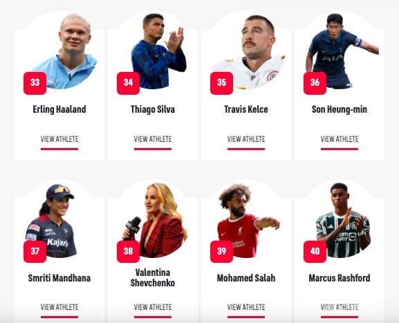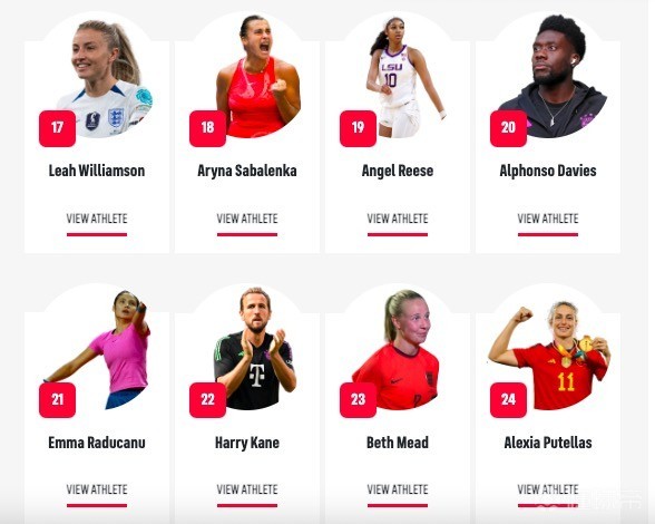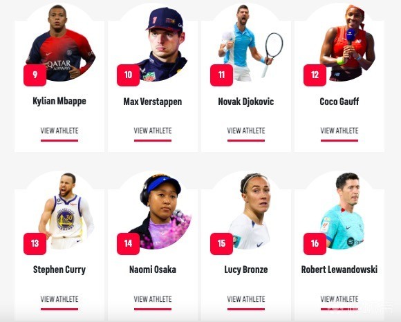 网球名将德约科维奇、高芙、大阪直美,NBA三分王库里,英格兰女足的布朗泽,波兰球星莱万等均排名前列。