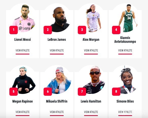 在榜单中,梅西的商业价值总评分达到了94.81分,詹姆斯、女足名宿摩根、NBA球星字母哥、女足球星梅根-拉皮诺埃、滑雪名将希福林、F1车手汉密尔顿、体操明星拜尔斯进入前八名。他们当中只有汉密尔顿与美国无关。第9名是法国足球名将姆巴佩、第10则是F1车手维斯塔潘。