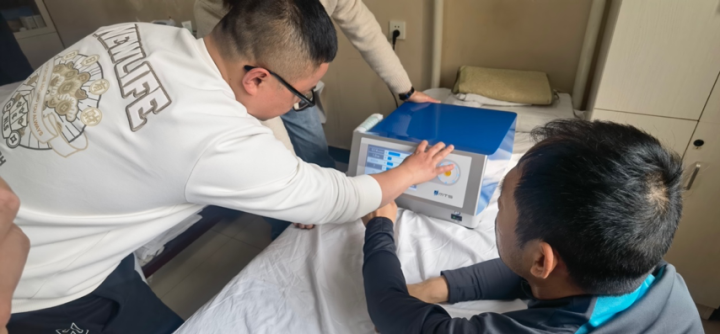 MTS Medical的工作人员将治疗仪器安装好后,为球队队医详细地讲解了仪器的使用方法以及注意事项,队员顾操亲自体验液电聚焦式冲击波治疗仪后治疗效果显著,患处得到明显改善。