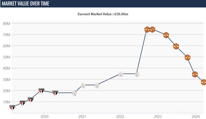 然而,在此之后,安东尼的身价一直在下降,2023年12月跌回到了转会前的3500万欧。到目前,安东尼的身价已经跌至2800万欧。