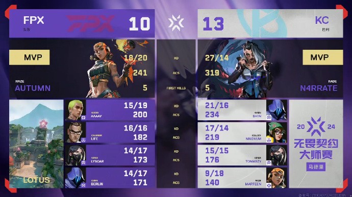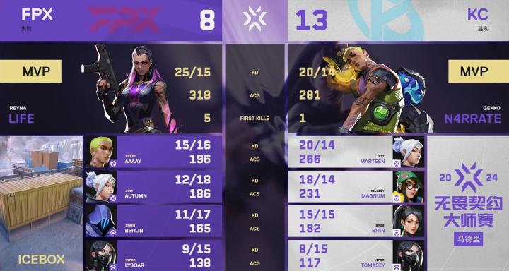 无畏契约马德里大师赛:FPX 0-2 KC,Life打出赛事首个ACE