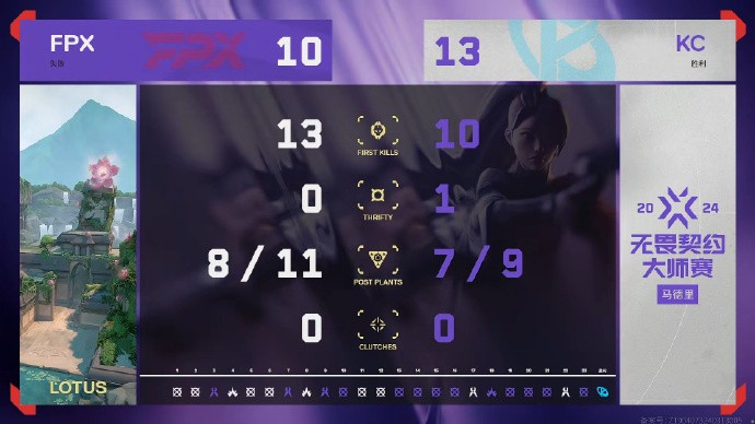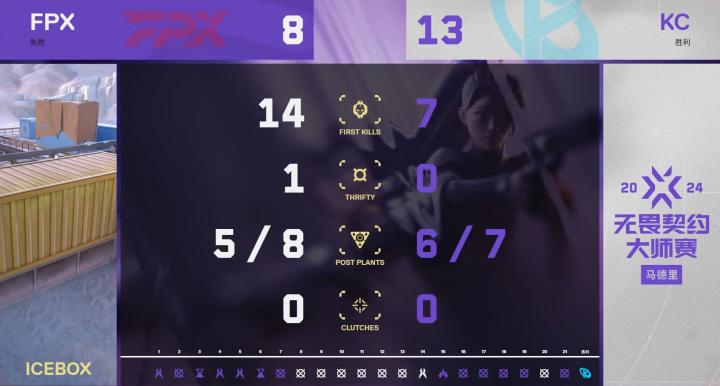 KC先发制人拿下手枪局,借助经济优势不断将优势扩大,以7-0领先,FPX早早用掉两个暂停及时调整状态,连续追7分将比分扳平。在KC12-7先拿到盘点后,FPX Life打出ACE扳回一分,无奈最终8-13先丢一局。