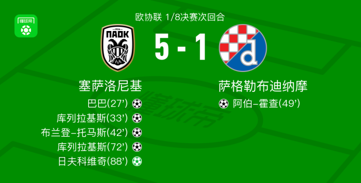 北京时间3月15日欧协联 1/8决赛次回合,塞萨洛尼基主场对阵萨格勒布迪纳摩。塞萨洛尼基巴巴破门,库列拉基斯梅开二度,布兰登-托马斯破门,日夫科维奇破门。萨格勒布迪纳摩阿伯-霍查破门。最终比分塞萨洛尼基5-1萨格勒布迪纳摩。