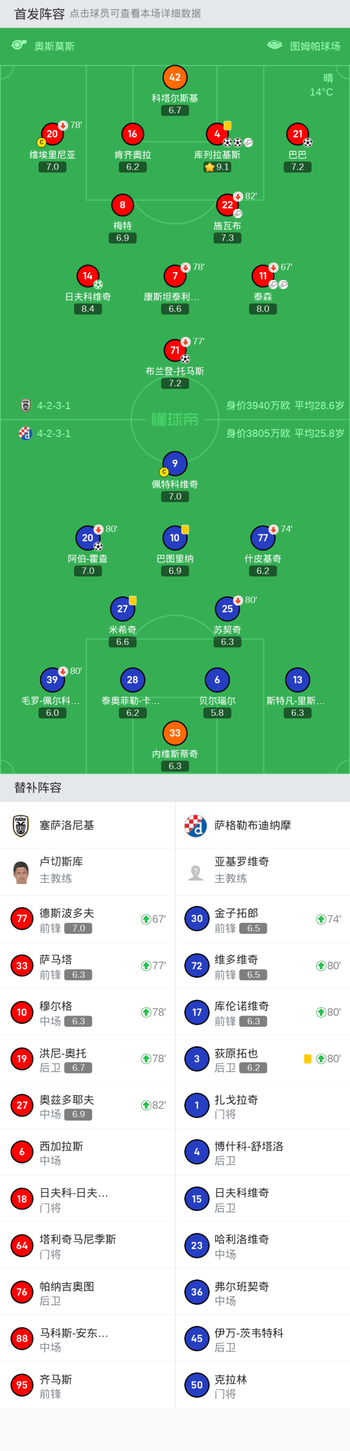 萨格勒布迪纳摩首发:28-泰奥菲勒-卡特林, 13-斯特凡-里斯托夫斯基, 27-米希奇, 9-佩特科维奇, 33-内维斯蒂奇, 6-贝尔瑙尔, 77-什皮基奇, 20-阿伯-霍查, 25-苏契奇, 39-毛罗-佩尔科维奇, 10-巴图里纳