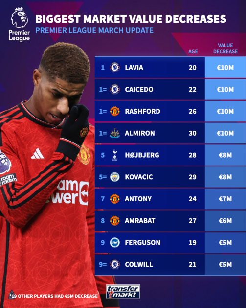 在毛里西奥·波切蒂诺的执教下,切尔西的八名球员在这次更新中都遭遇了身价下调。不出所料,切尔西的两名球员——莫伊塞斯·凯塞多和 罗密欧·拉维亚—与米格尔·阿尔米隆和马库斯·拉什福德一道,遭遇了幅度最大的身价下调( €1000 万欧元)。