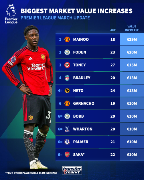 本次更新的最大赢家是科比·梅努(Kobbie Mainoo)。这位曼联新秀本赛季表现出色,他的身价不可思议地增加了 2900 万欧元,达到 3500 万欧元。梅努被广泛认为是这个时代最具天赋的球员之一,他现在是世界上第四值钱的十几岁中场球员。