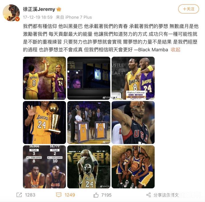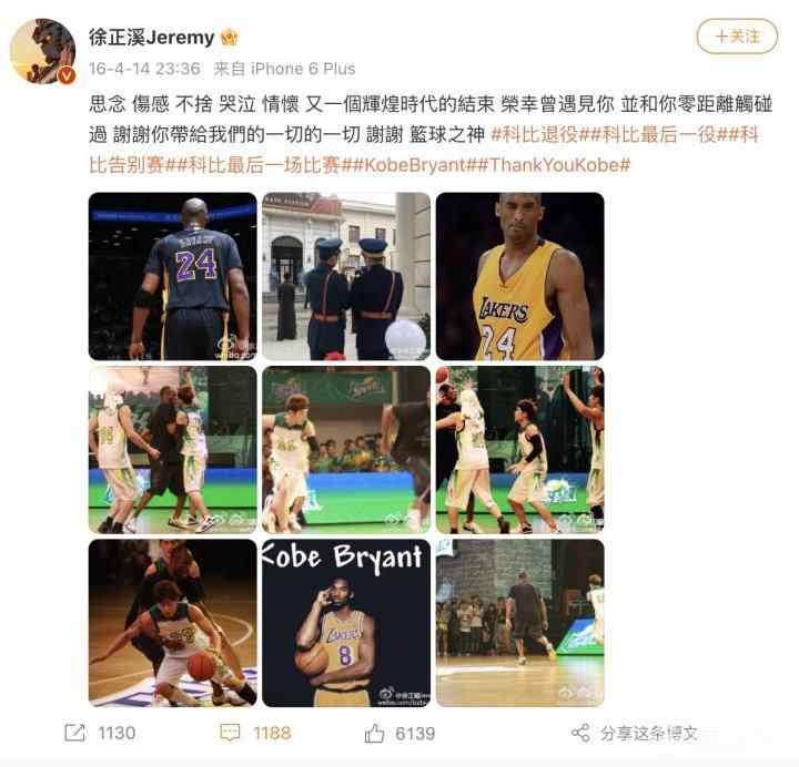 值得一提的是,徐正溪在本条动态中,使用了NBA传奇球员科比退役的背影图。他也曾经在自己的社媒账号中,多次发布有关科比的内容,表达自己对科比以及曼巴精神的崇尚与尊敬。