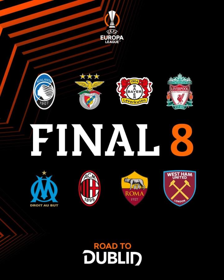 欧联杯八强为:马赛(法国)、本菲卡(葡萄牙)、西汉姆联(英格兰)、米兰(意大利)、利物浦(英格兰)、罗马(意大利)、亚特兰大(意大利)、勒沃库森(德国)。