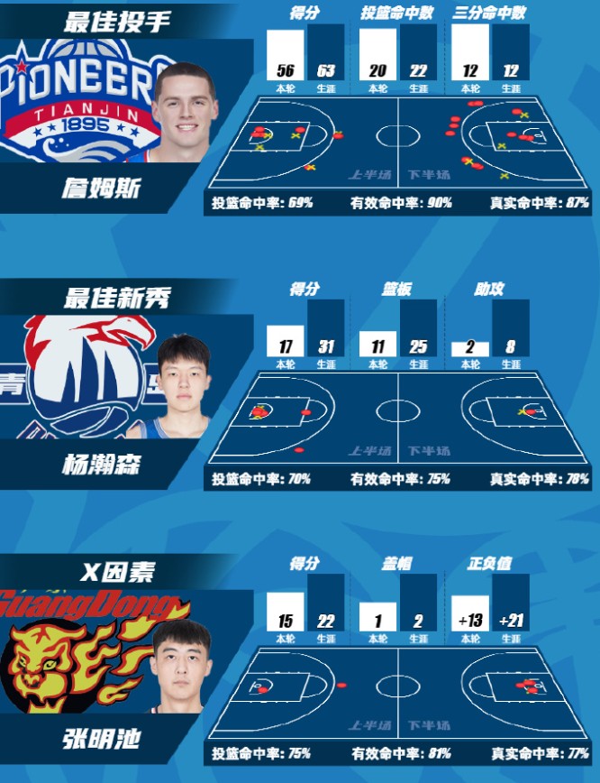 天津球员詹姆斯以单场56分的数据领衔得分榜;