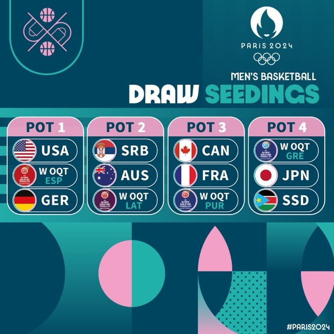 美国队、德国队与奥运会资格赛西班牙赛区的冠军组成一档球队;澳大利亚队和塞尔维亚队进入第二档球队;日本队、南苏丹队进入第四档;东道主法国队和加拿大队为三档球队;