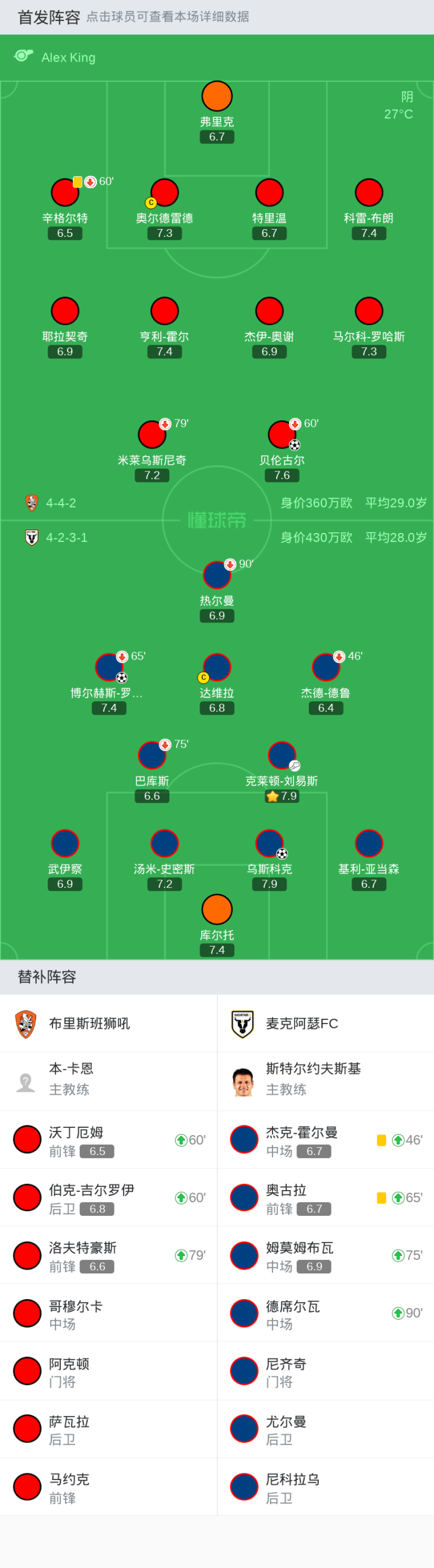 上场替补:90'+47-德席尔瓦, 75'24-姆莫姆布瓦, 46'8-杰克-霍尔曼, 65'36-奥古拉