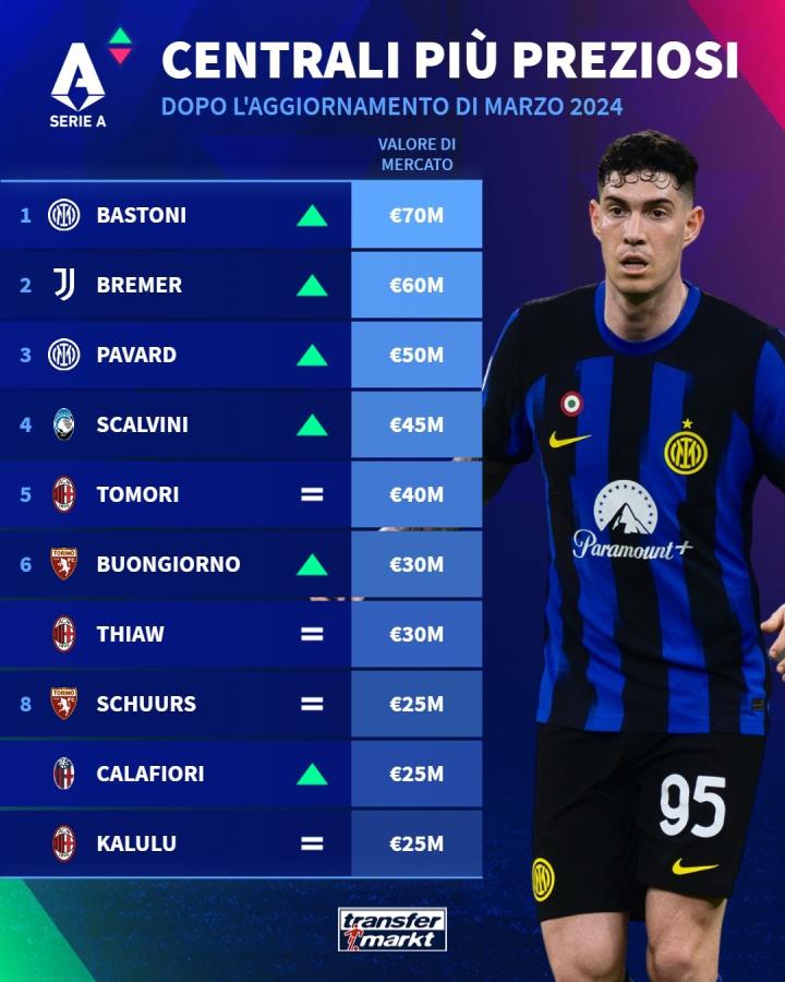近日,德国转会市场网站更新了意甲球员身价,并列出了意甲中卫身价排行榜TOP10,国米后卫巴斯托尼7000万欧居首,尤文后卫布雷默以6000万欧排名第二,另一位国米后卫帕瓦尔以5000万欧排名第三。