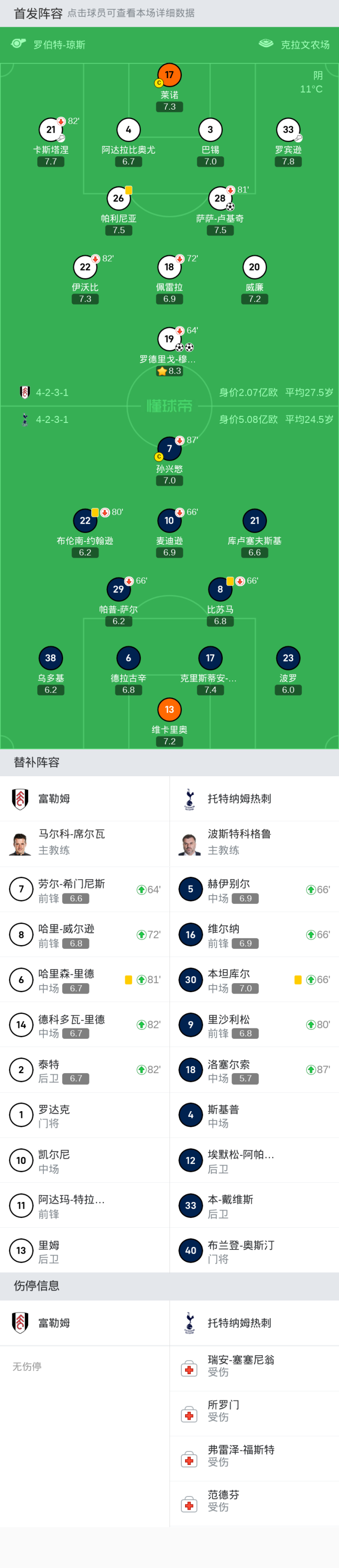 富勒姆首发:20-威廉, 17-莱诺, 22-伊沃比, 28-萨萨-卢基奇, 18-佩雷拉, 26-帕利尼亚, 21-卡斯塔涅, 4-阿达拉比奥尤, 33-罗宾逊, 3-巴锡, 19-罗德里戈-穆尼斯