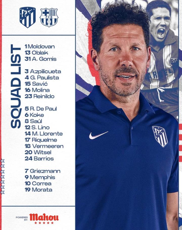 马竞战巴萨大名单:格列兹曼、莫拉塔领衔锋线,科克坐镇中场
