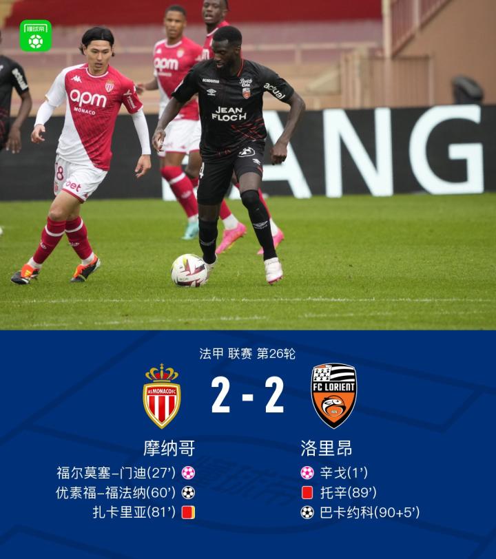 摩纳哥2-2洛里昂,扎卡里亚染红,巴卡约科读秒绝平