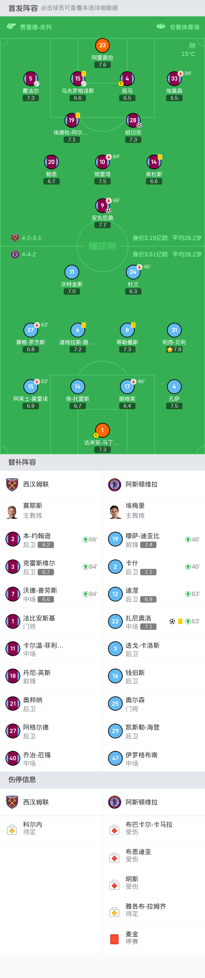 阿斯顿维拉首发:1-达米安-马丁内斯, 17-朗格莱, 15-阿莱士-莫雷诺, 8-蒂勒曼斯, 11-沃特金斯, 31-利昂-贝利, 14-保-托雷斯, 4-孔萨, 6-道格拉斯-路易斯, 27-摩根-罗杰斯, 24-杜兰