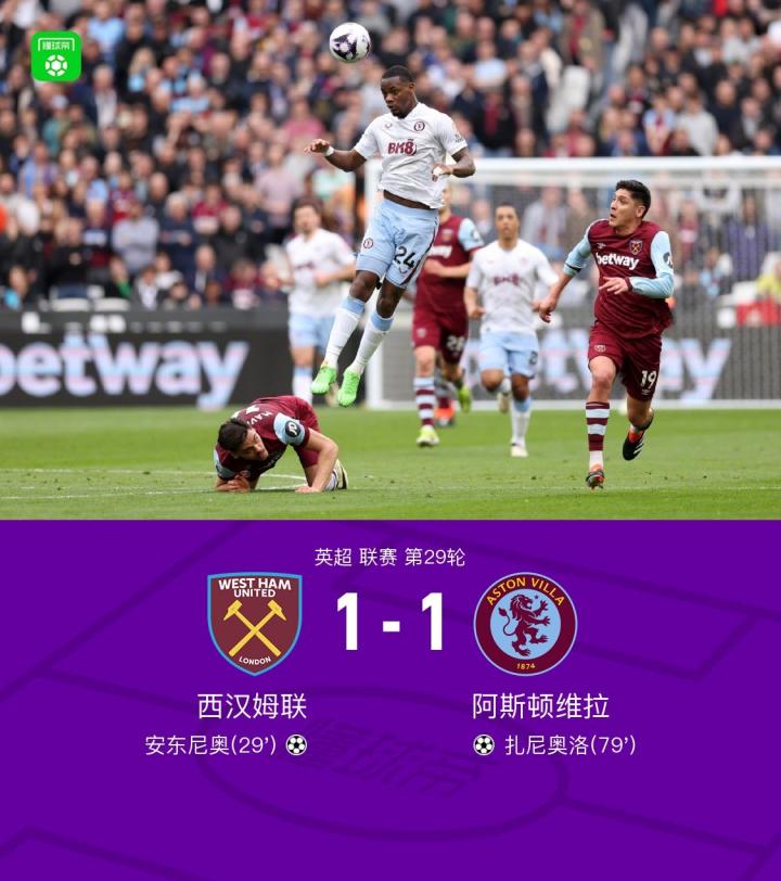 西汉姆联1-1阿斯顿维拉,安东尼奥破门,扎尼奥洛扳平比分