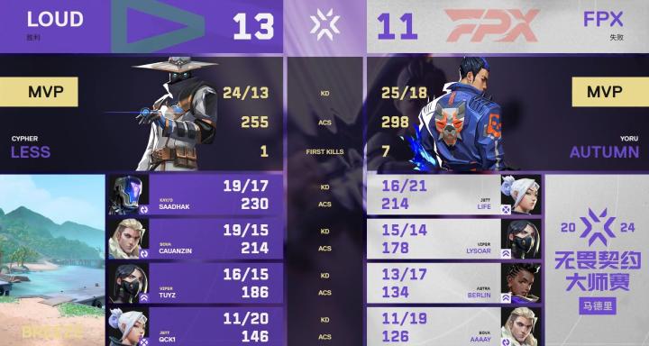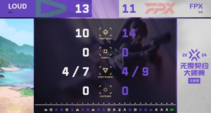 第22小局,双方在A点互换蝰蛇终极技能,Loud完成存钱局翻盘,11-11平。第23局,FPX率先攻占B点,Loud回防打出3换5,12-11拿到赛点。第24小局,Life开启飓刃被冥狙架死,Autumn1打4残局无力回天,FPX 11-13 LOUD输掉图二,惨遭淘汰。