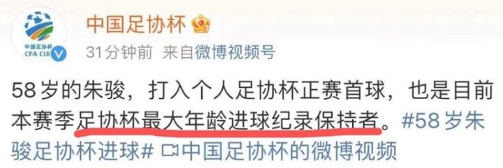 上海橘橙(赛更达)在足协杯首轮7-0大胜南宁东方聚鼎,作为投资人的朱骏打进一球,成为足协杯最大年龄进球者(58岁)。上观新闻记者陈华撰文点评道——不管球迷是否喜欢他,这个超级球痴热爱足球运动的那股劲头,值得尊重。