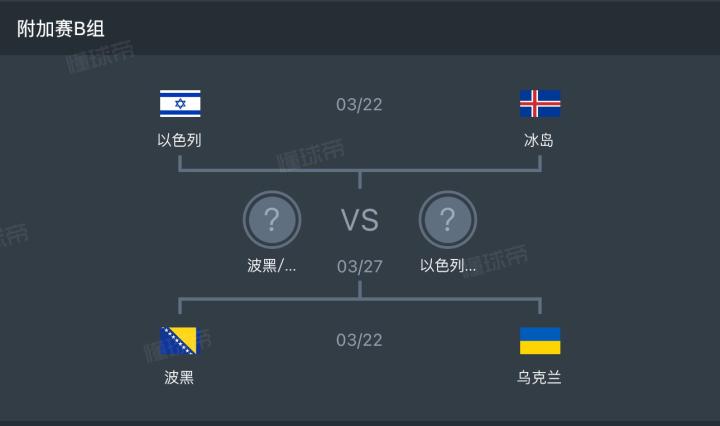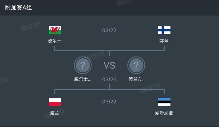 附加赛半决赛:3月22日星期五 格鲁吉亚vs卢森堡、威尔士vs芬兰、波黑vs乌克兰、波兰vs爱沙尼亚、以色列vs冰岛、希腊vs哈萨克斯坦