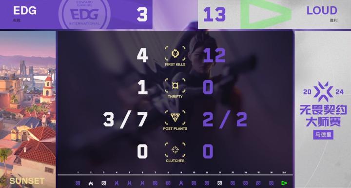 下半场EDG拿下手枪局,但Loud赌点A完成存钱分翻盘,EDG2-12送出局点。第15小局,Loud tuyZ绕后双杀完成残局,EDG 2-13 Loud先输一局。