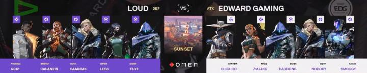EDG防守方开局,输掉手枪局,Loud qck1捷风发挥出色帮助队伍4-1领先,EDG仅在奖励局拿分,叫出首个暂停。第6小局,CHICHOO和Haodong中期被断,Loud3打2拿分。第7小局,EDG存钱局,1-6,叫出第二个暂停。第8小局,康康起出无甲冥狙,Loud cauanzin开启狂猎之怒击杀nobody,顺势占领A点安置爆能器,Smoggy完成4杀无奈时间被拖够,1-7。第9小局,Loud qck1B点双杀破点,EDG直接保枪。第10小局,Loud3打3进入B点,蝰蛇开启大招,EDG再丢一分,1-9。第11小局,Loud Saadhak3杀,EDG瞬间被摧毁,1-10。第12小局,Loud0换5,EDG上半场1-11落后。