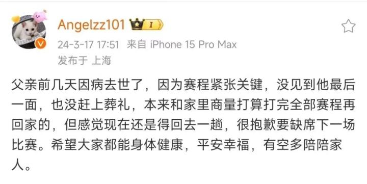 Angel发文表示:父亲前几天因病去世了,因为赛程紧张关键,没见到他最后一面,也没赶上葬礼,本来和家里商量打算打完全部赛程再回家的,但感觉现在还是得回去一趟,很抱歉要缺席下一场比赛。希望大家都能身体健康,平安幸福,有空多陪陪家人。
